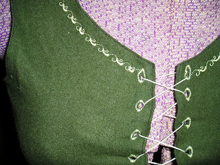 The final result: a surcot , a sleeveless dress to wear over a dress.I use 2.3m of wool flannel .I did eyelets (by machine) in the front to close it with a white wax linen .The side and the back are open from the hip.I did embroideries at the collar , the front , the bottom and all around the open part .The back is made of one piece , the original is done of three parts for the half .